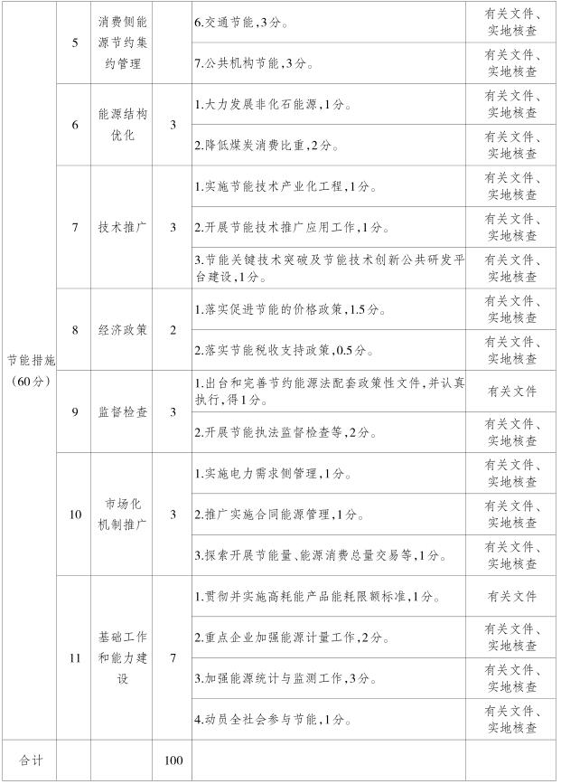 2.節(jié)能措施落實情況指標為定性考核指標,滿分為60分。主要包括目標責任、結(jié)構(gòu)調(diào)整、重點工程、消費側(cè)能源節(jié)約集約管理、能源結(jié)構(gòu)優(yōu)化、技術推廣、經(jīng)濟政策、監(jiān)督檢查、市場化機制推廣、基礎工作和能力建設等10個方面內(nèi)容。
