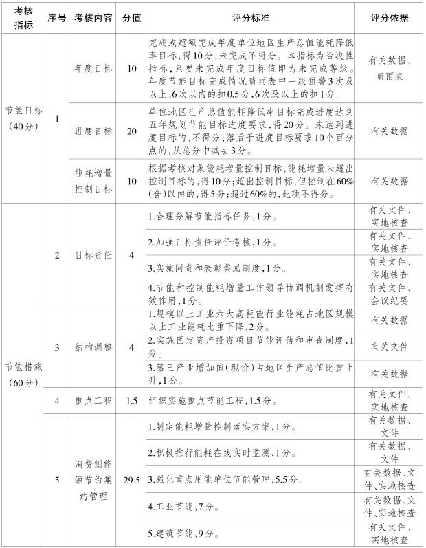 1.節(jié)能目標完成情況為定量考核指標,滿分為40分。以市政府確定的各縣(市、區(qū))萬元地區(qū)生產(chǎn)總值能耗降低年度和進度目標、能耗增量控制目標為基準,依據(jù)市統(tǒng)計局核定的年度指標完成情況進行評分。