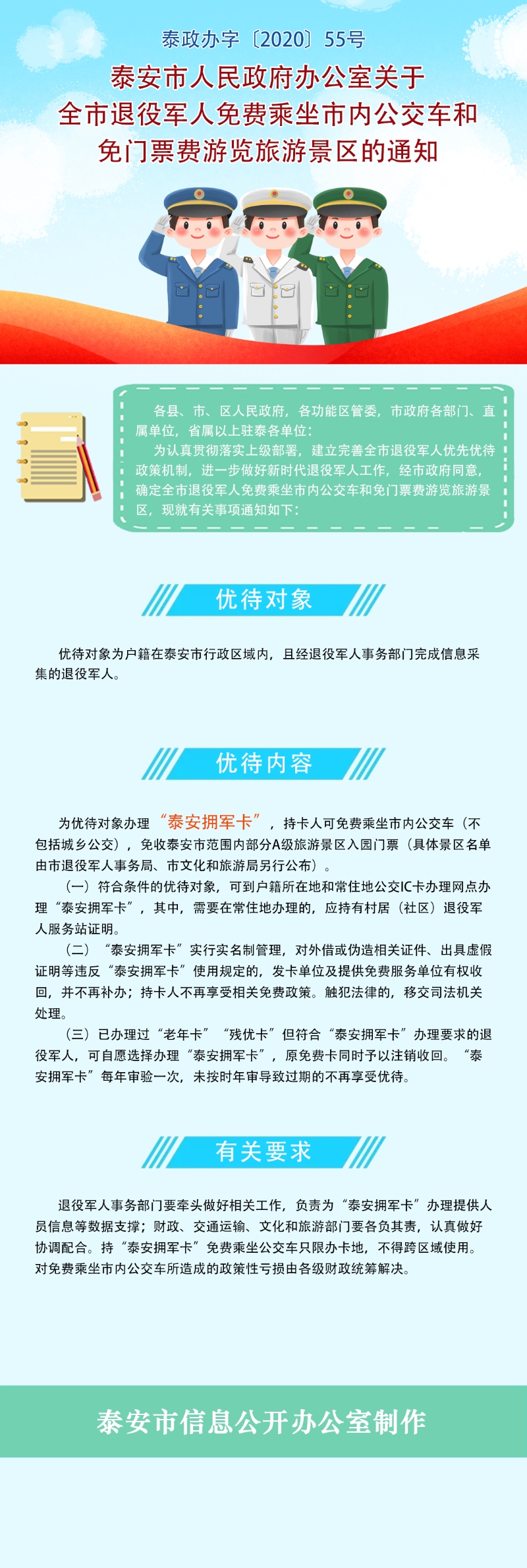 【圖解】泰政辦字〔2020〕55號 泰安市人民政府辦公室關于全市退役軍人免費乘坐市內公交車和免門票費游覽旅游景區的通知
