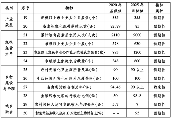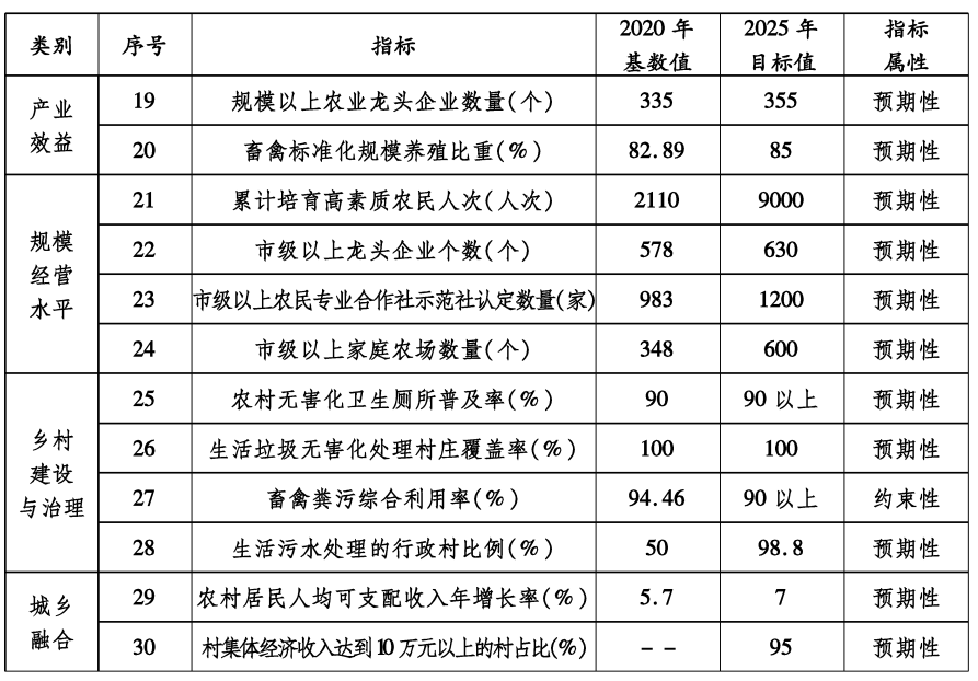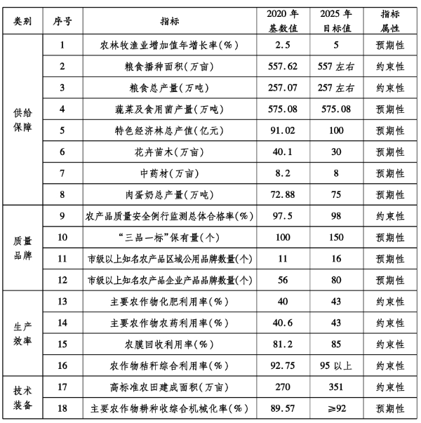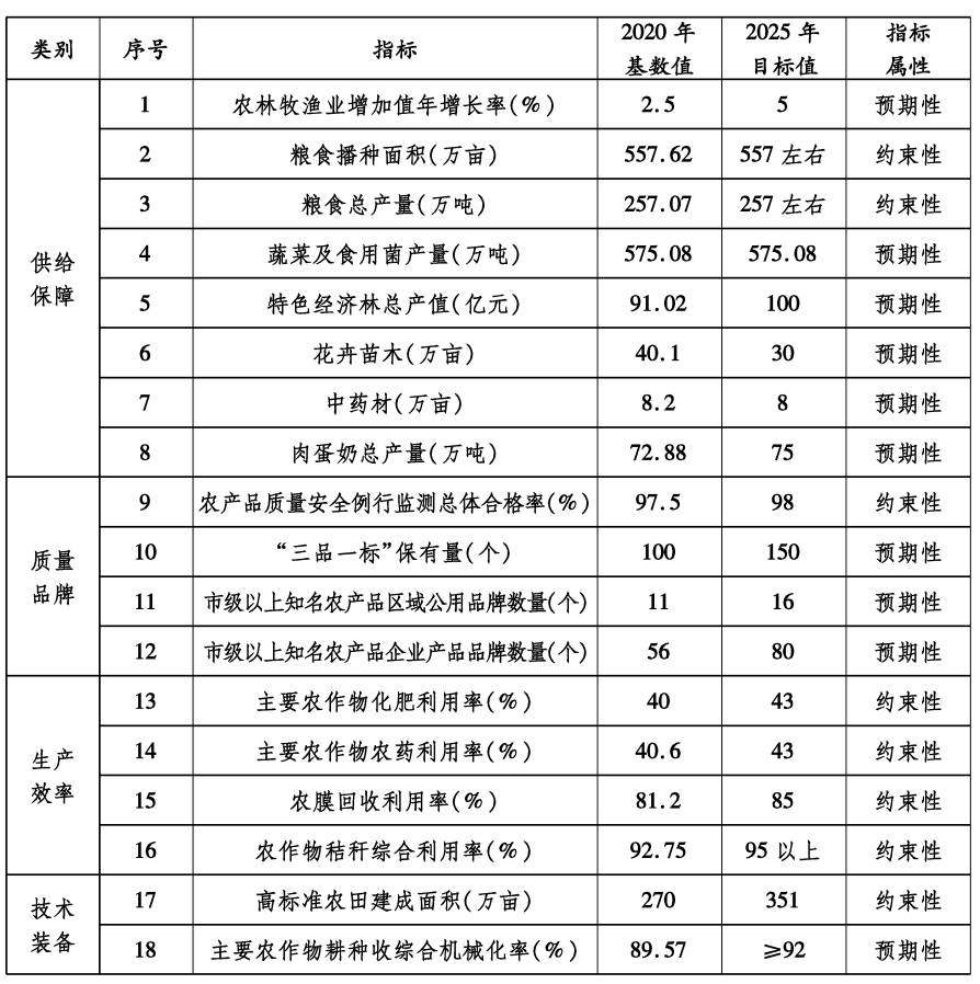 到“十四五”末,全市農業綜合生產能力進一步提高,現代農業體系基本建成,農業綠色發展水平大幅提升,農業一二三產融合發展格局基本形成,鄉村經濟多元化融合發展,生態宜居的美麗鄉村建設扎實推進,農業農村基礎設施建設和公共服務能力顯著提升,城鄉統一的社會保障制度體系進一步完善,農民生產生活條件進一步改善,收入水平大幅提升,鄉村治理能力有效增強,現代鄉村治理體系初步構建。堅持梯次推進鄉村振興,到2025年,農林牧漁業增加值年增長率達到5%,農村居民人均可支配收入年增長7%左右,80%縣(市、區)、功能區基本實現農業農村現代化;糧食產量穩定在257萬噸,生豬出欄量穩定在150萬頭;主要農作物良種覆蓋率達到99%以上;農作物耕種收綜合機械化率達到92%以上;農產品加工業產值與農業總產值達到2.8:1左右。