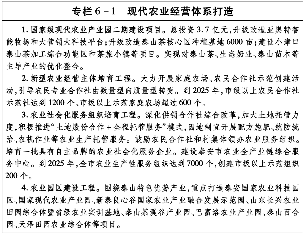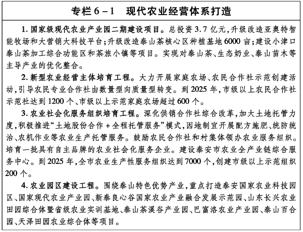 1.農業更加高質高效。農業差異化發展新格局逐步形成,優質農產品供給能更好地滿足居民消費升級和泰安旅游發展新需求,新型農業生產經營主體帶動能力進一步增強,農業質量效益和整體競爭力顯著提升。休閑農業和鄉村旅游實現全域發展,農產品精深加工提檔升級,農產品流通體系安全高效,形成一批特色鮮明、競爭有力、業態豐富、一二三產業融合發展的全產業鏈示范區。