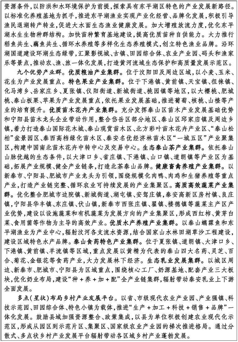 1.農業現代化發展布局。集中優勢資源形成農業科技創新、交易展示活力核,建設泰山休閑農業融合發展區、泰東南生態農業發展片區、汶河高效農業發展片區、東平湖域生態產業保育區四大農業產業發展區塊,重點發展糧油、林果、蔬菜、苗木、泰山茶、畜禽、水產品、泰山食藥、生態乳等九類優勢主導產業和特色品牌產業,著力打造“一核、四區、九群、多園”的農業農村高質量發展新高地。