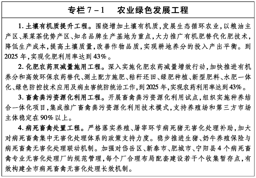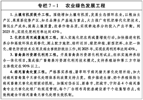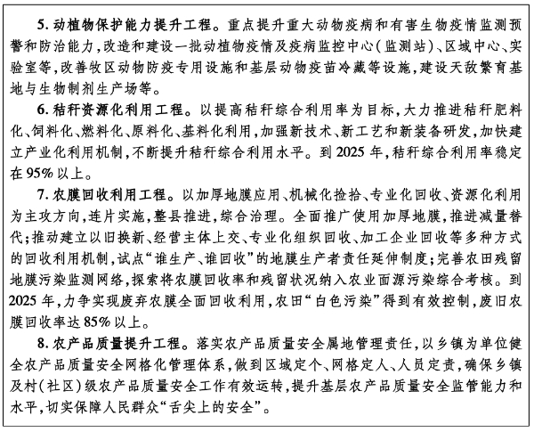 2.堅持農業綠色循環發展。推動農業發展模式向綠色、環保、節約型轉變,以節地、節水、節肥、節藥、節種、節能和資源綜合循環利用為重點,分區域、分作物總結一批化肥減量增效技術模式,建設推廣一批化肥減量增效技術服務示范基地。到2025年,化肥利用率達到43%。持續推進農藥減量控害,深入開展農藥減量增效和綠色防控替代化學防治行動,推廣使用生態控制、生物防治、理化誘控等綠色增產技術和新型植保機械,打造一批農作物病蟲害全程綠色防控技術模式。開展科學安全用藥技能培訓,推廣精準高效施藥、輪換用藥技術,穩妥推進高毒農藥淘汰工作。加強農藥安全使用監督檢查,加大違規使用農藥問題的查處力度。扶持發展裝備精良、技術先進、管理規范的植保社會化服務組織,積極推行專業化統防統治,打造一批全程綠色防控示范樣板。到2025年,農藥利用率達到43%。持續推進農業廢棄物綜合利用,積極培育發展生態農業循環鏈,在生豬、肉鴨、奶牛主產區,大力推廣畜禽糞便資源化利用技術,加強畜禽規模養殖場糞污資源化處理設施建設,提高散養畜禽糞污資源化利用率。大力推廣秸稈反應堆、秸稈固化成型燃料、深翻還田、撿拾打捆、秸稈離田多元利用等技術,推動秸稈全量利用,培育一批秸稈收儲運和綜合利用市場化主體。推進農藥包裝物回收利用。加快推廣應用可降解農膜,開展農膜區域性綠色補償制度試點。到2025年,畜禽糞污綜合利用率達90%以上,秸稈綜合利用率達95%以上,廢舊農膜回收率達85%以上。