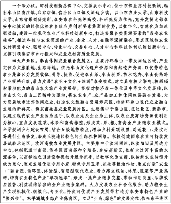 (四)發展定位和布局。按照“東拓、西興、南展、北控、中優”的城市空間發展戰略,搶抓國家“兩新一重”建設和省“一群兩心三圈”兩大機遇,全面推進農業“三鏈重構”,著力構建農業“四種業態”,大力實施產業集群、農文旅融合、綠色發展、科技支撐、城鄉融合、治理提升戰略,努力構建特色產業聚集、農文旅融合促進、生態綠色高效、科技創新協同、城鄉一體發展、共建共享共治的“一市四區”(農業農村高質量發展先行市,生態高效農業發展示范區、濟泰現代農業協同創新區、創新農業發展高地和品牌農業建設先行區、農村綜合集成改革試驗區)新格局。