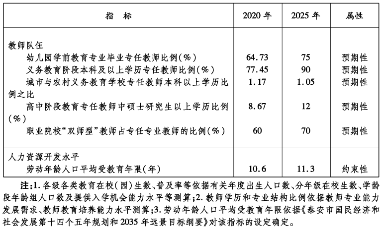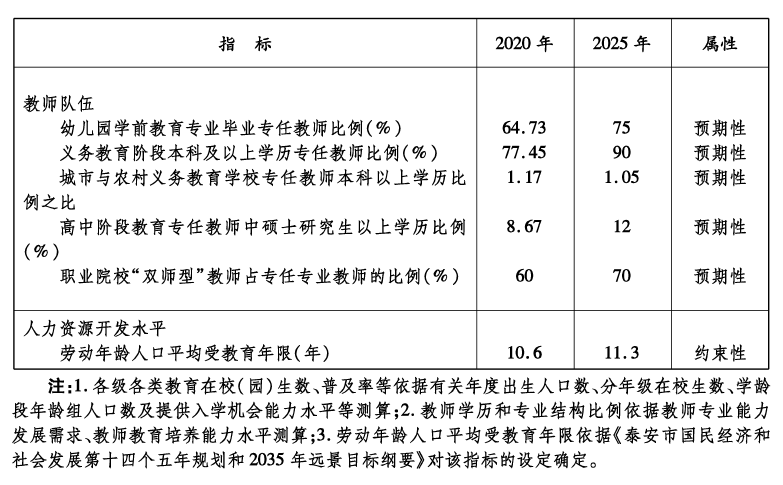 到2025年,高質量教育體系基本建成,教育治理效能明顯提升,教育內生動力和發展活力進一步激發,人才培養水平和教育服務貢獻能力顯著增強,學習型、創新型、技能型社會建設加速推進,教育現代化水平走在全省前列。到2035年,全面實現教育現代化,形成泰安地域特色教育品牌,全面建成教育強市和人力資源強市,教育發展規模和綜合實力位居全省前列。