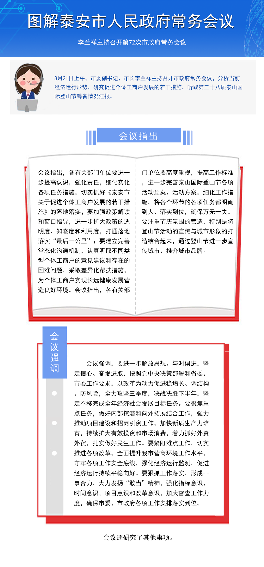會議議題:分析當前經(jīng)濟運行形勢,研究促進個體工商戶發(fā)展的若干措施,聽取第三十八屆泰山國際登山節(jié)籌備情況匯報。