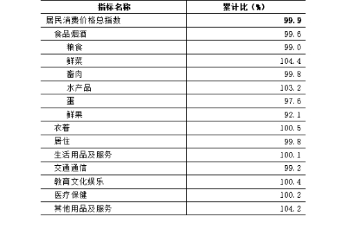 居民消費價格總指數(CPI)比上年下降0.1%,其中,食品煙酒價格下降0.4%,衣著價格上漲0.5%,居住價格下降0.2%,生活用品及服務價格上漲0.1%,交通通信價格下降0.8%,教育文化娛樂價格上漲0.4%,醫(yī)療保健價格上漲0.2%,其他用品及服務價格上漲4.2%。