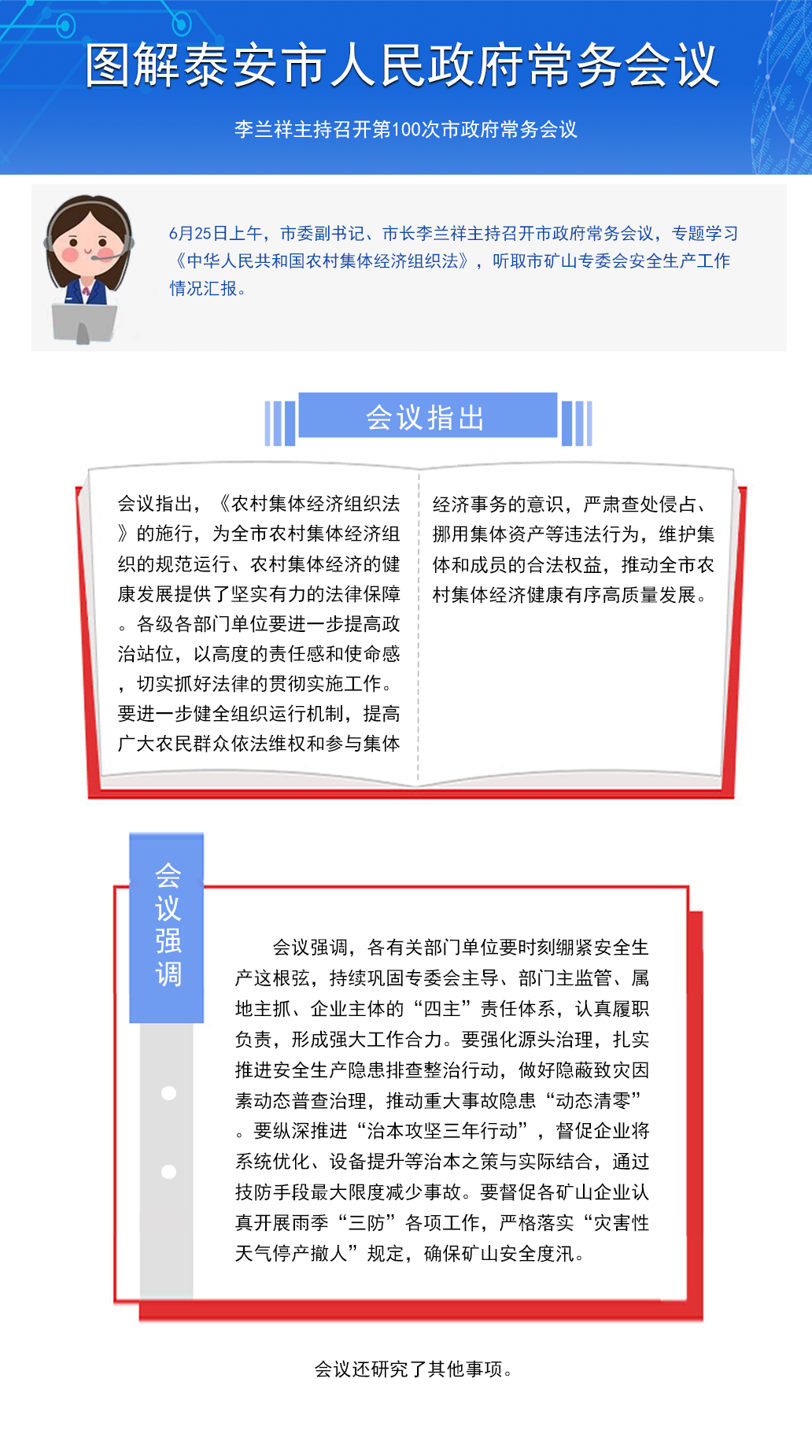 6月25日上午,市委副書記、市長李蘭祥主持召開市政府常務會議,專題學習《中華人民共和國農(nóng)村集體經(jīng)濟組織法》,聽取市礦山專委會安全生產(chǎn)工作情況匯報。